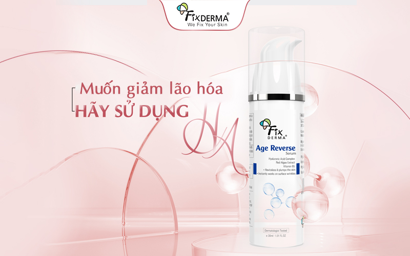 Fixderma Age Reverse Serum 30ml là serum giảm nếp nhăn với công thức dưỡng ẩm và hỗ trợ làm giảm dấu hiệu lão hóa vượt trội. Sản phẩm chứa Niacinamide giúp tăng Ceramide, thu nhỏ lỗ chân lông, làm mịn da; Hylasome EG10 – Hyaluronic Acid liên kết chéo giữ nước gấp 50 lần, dưỡng ẩm sâu và thúc đẩy Collagen; Sodium Hyaluronate cung cấp độ ẩm bền vững; Panthenol hỗ trợ làm dịu da và bảo vệ da. Serum hỗ trợ giảm nếp nhăn, vết chân chim, cải thiện độ đàn hồi, mang lại làn da căng mướt, mịn màng, rạng rỡ. Phù hợp cho mọi loại da, kể cả da nhạy cảm, dùng chăm sóc da hằng ngày.