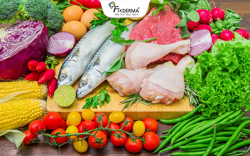• Collagen: Có nhiều trong thịt gà, cá, trái cây mọng, giúp da săn chắc, cải thiện sau quá trình giảm mụn.