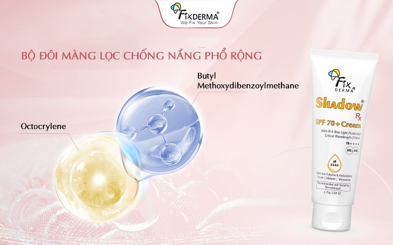 Một trong những điểm làm nên sự khác biệt của Fixderma Shadow SPF 70+ Cream chính là bảng thành phần được nghiên cứu kỹ lưỡng, kết hợp giữa các màng lọc hóa học, vật lý và hoạt chất dưỡng da tiên tiến.
