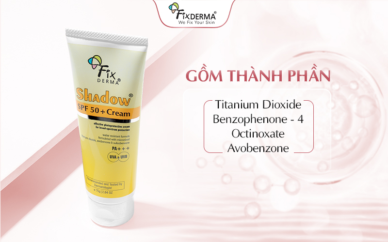Fixderma Shadow SPF 50+ Cream được nhiều người review cho đánh giá cao về sự lành tính của các thành phần tạo nên sản phẩm. Một số thành phần nổi bật của kem chống nắng như: