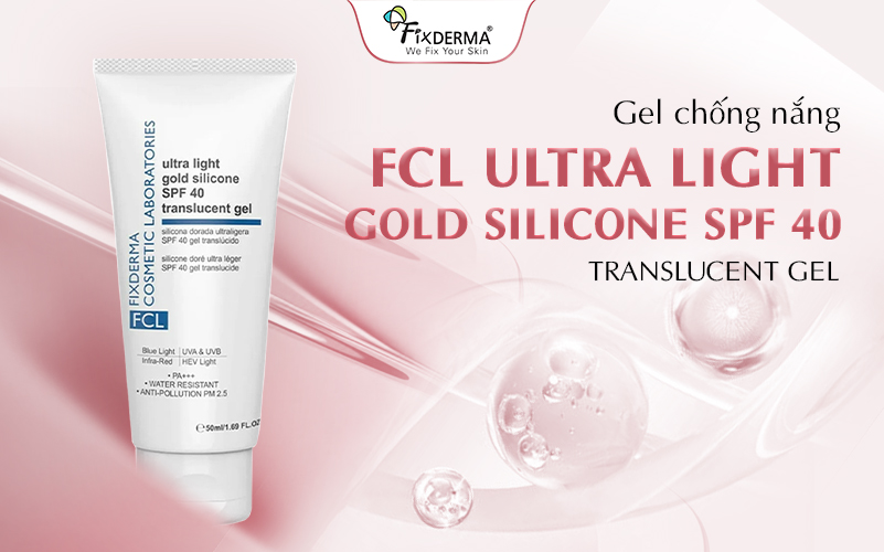 FCL Ultra Light Gold Silicone SPF 40 Translucent Gel giúp bảo vệ da trước tia UVA, UVB, ánh sáng xanh, tia hồng ngoại IR và ánh sáng năng lượng cao nhìn thấy được. Sản phẩm có kết cấu nhẹ, hạn chế bết dính, phù hợp cho da dầu mụn, với SPF 40 và PA+++ đáp ứng nhu cầu sử dụng hằng ngày.